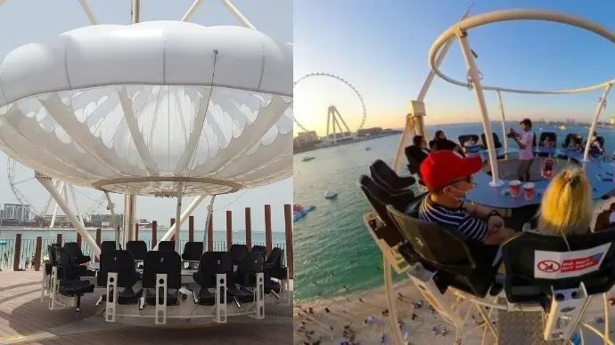 Your Flying Cup experience begins as you step on to a circular dining platform set within a latticed circular structure in the Beach, JBR. Once you are ready, the table will be hoisted 40 meters off the ground. For the next 20 minutes, you will relax in your chair and skim over the city. As the table swivels, it gives you the unobstructed 360 degree views of Burj Al Arab, Ain Dubai, and practically the entire of Blue water Islands, Palm Jumeirah, and Dubai Marina.